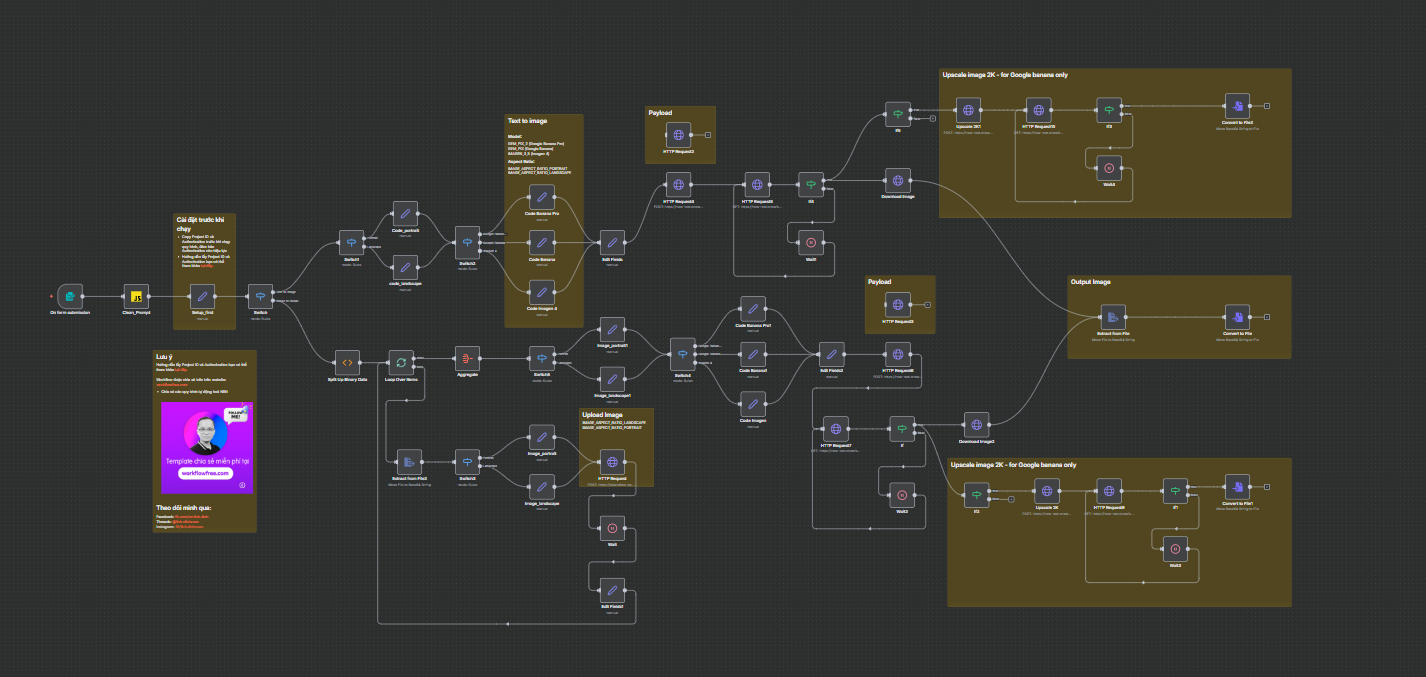 Workflow sử dụng n8n làm công cụ tự động hóa, cùng với API của Google (Google Nano Banana Pro, Nano Banana, Imagen 4), giúp tạo hình ảnh từ văn bản.