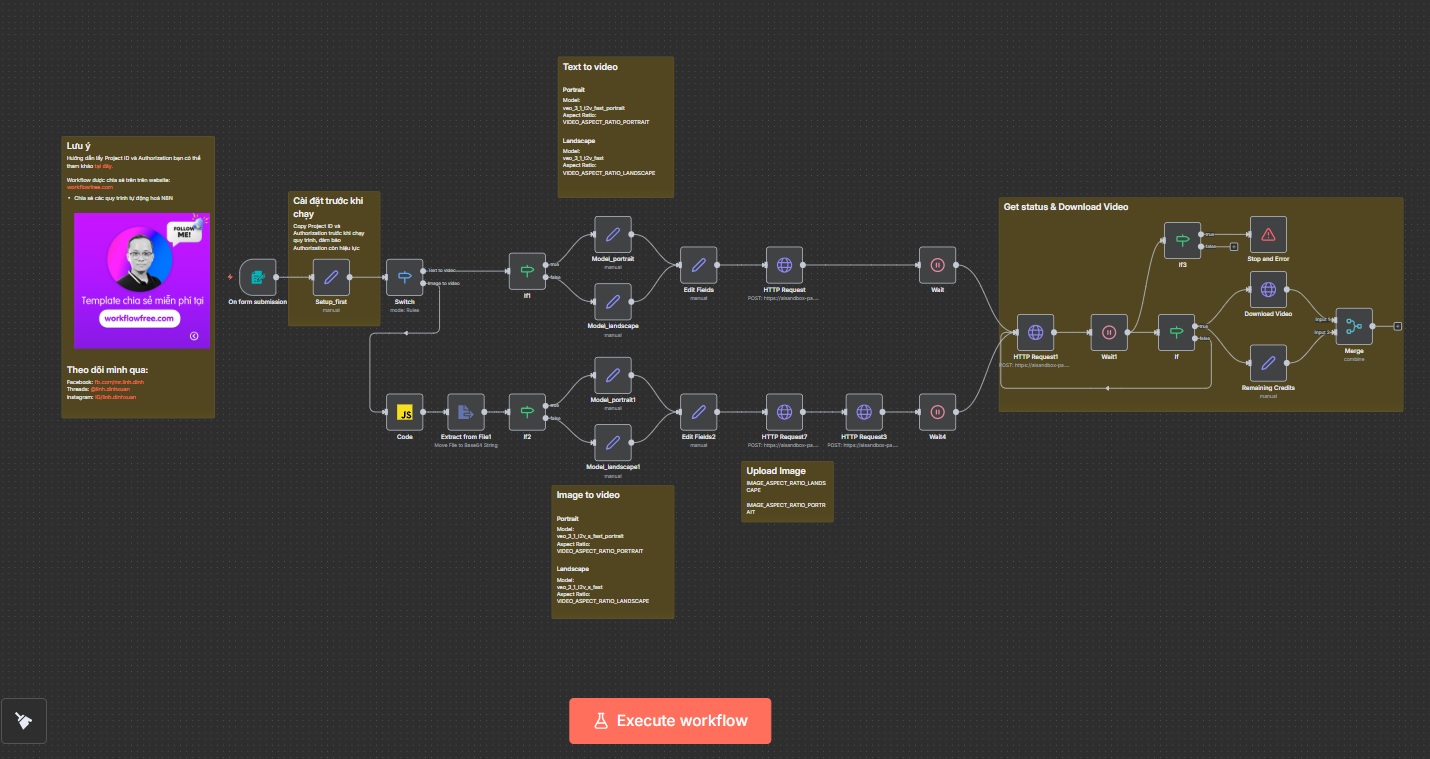 Quy trình này vẫn có thể sử dụng model Veo 3.1 – Quanlity chất lượng hơn với mỗi lần tạo tốn 100 credit. Bạn sẽ cần phải thay đổi lại model trong node Edit thứ 2 và thứ 3 trong quy trình.