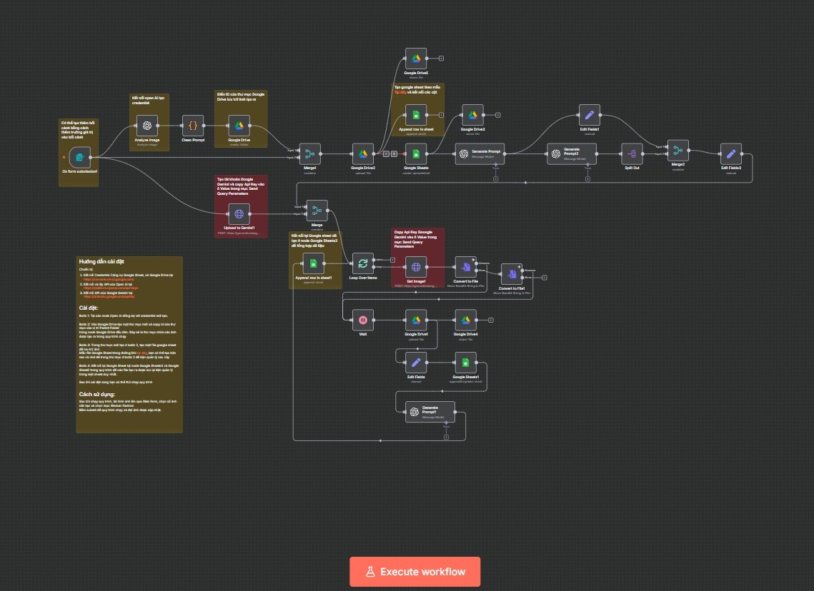 - Chạy thử workflow: upload ảnh qua form, chọn số lượng ảnh và bối cảnh → ảnh sẽ tự động sinh và lưu về Drive + quản lý trong Sheets.